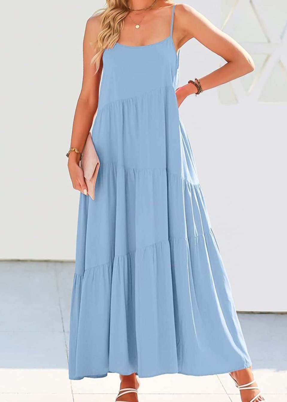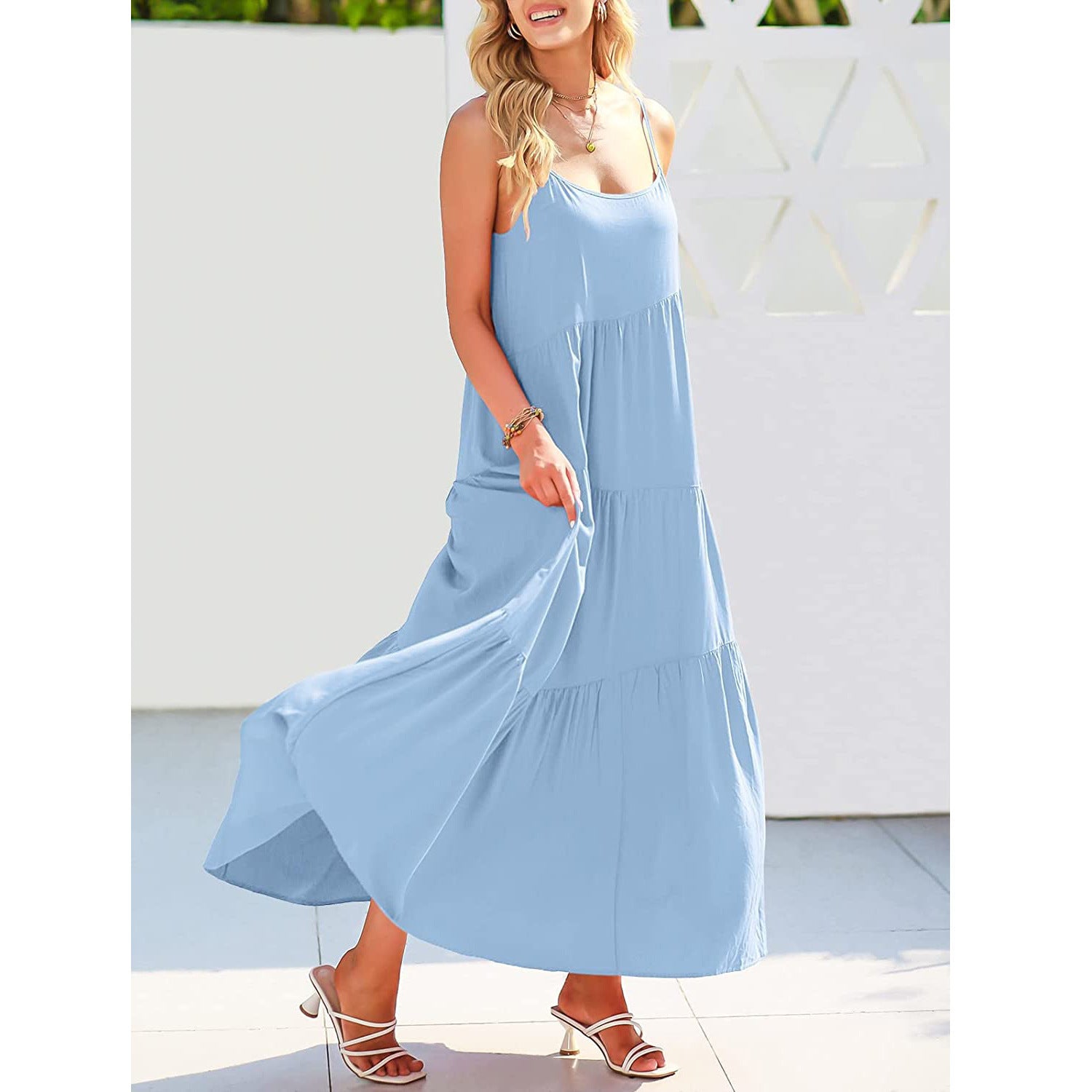 Features: Adjustable spaghetti straps maxi dress with asymmetrical layering and flowing hem swing. Loose fit, summer beach dress,flowy daywear